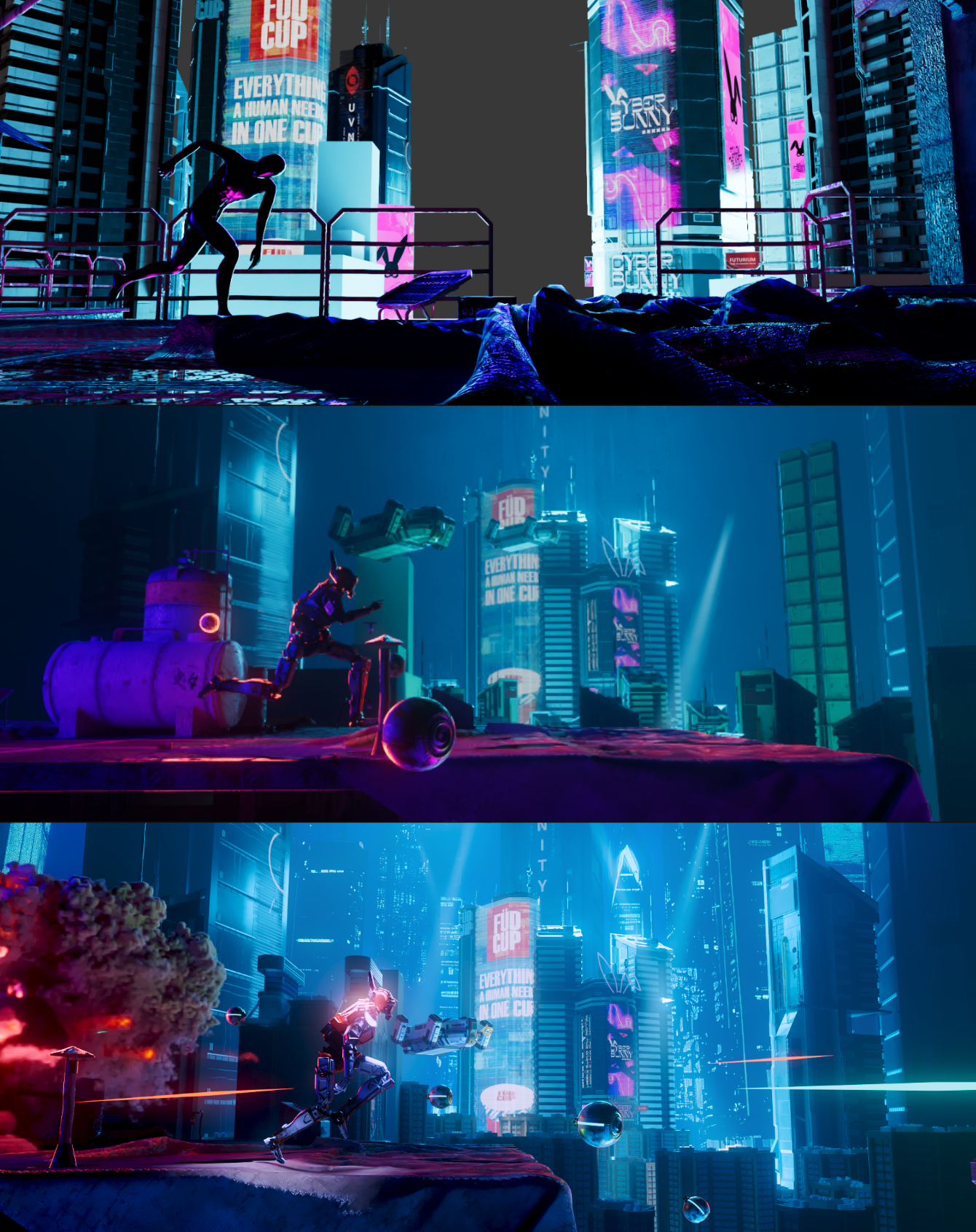 Starting from the original challenge template, I built a sci-fi world where a robot is being chased, imagining the scene high up among modern buildings with a view of the city below, and adding smaller robots as his protectors to add more depth to the story.
